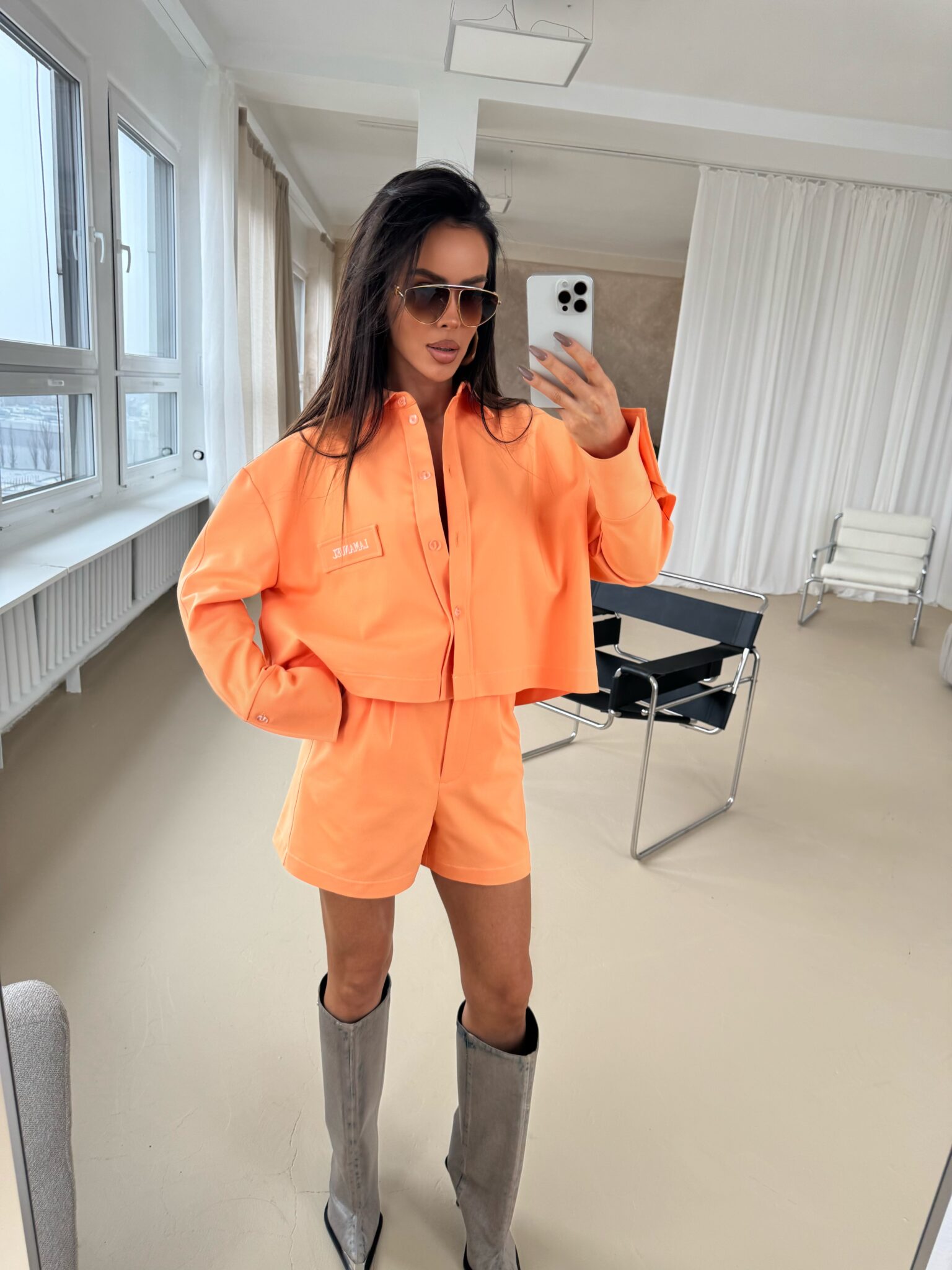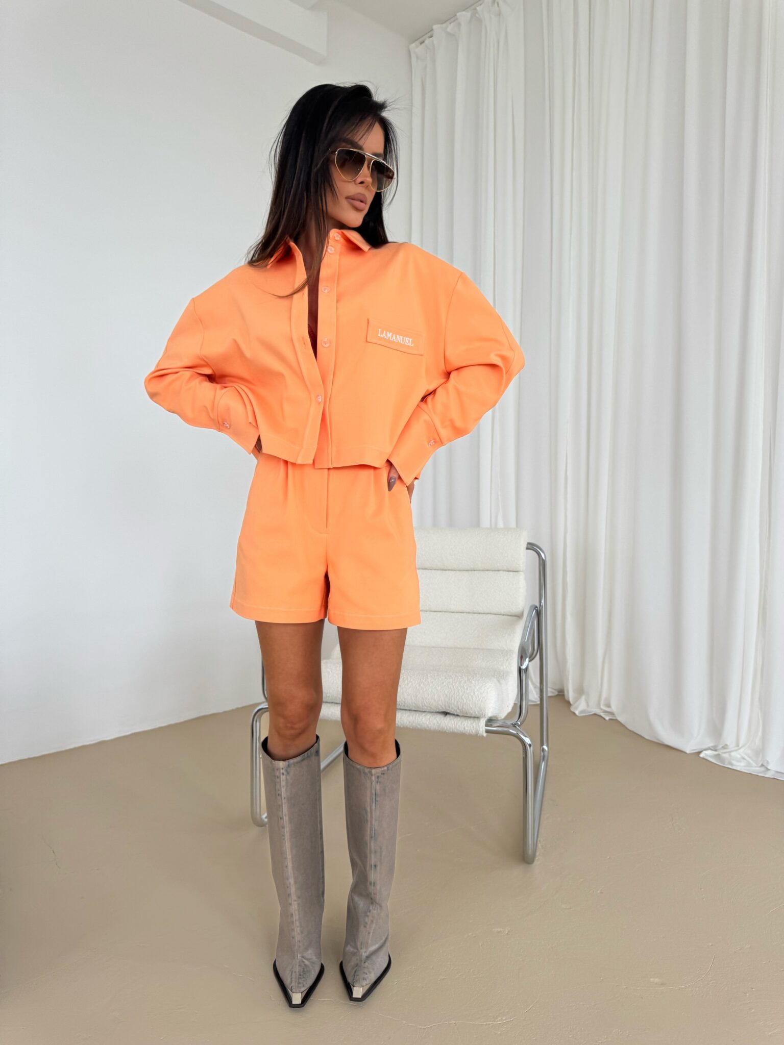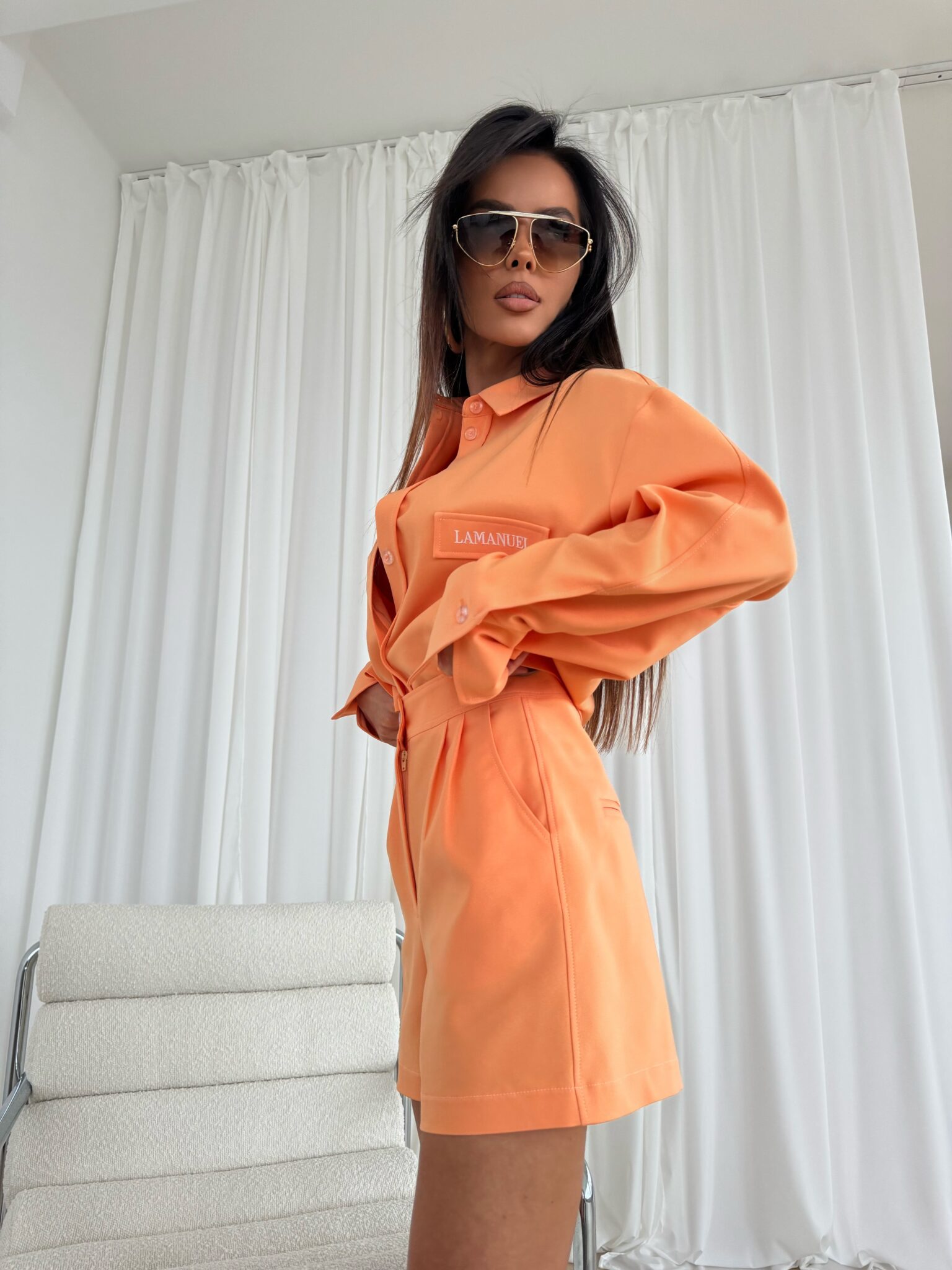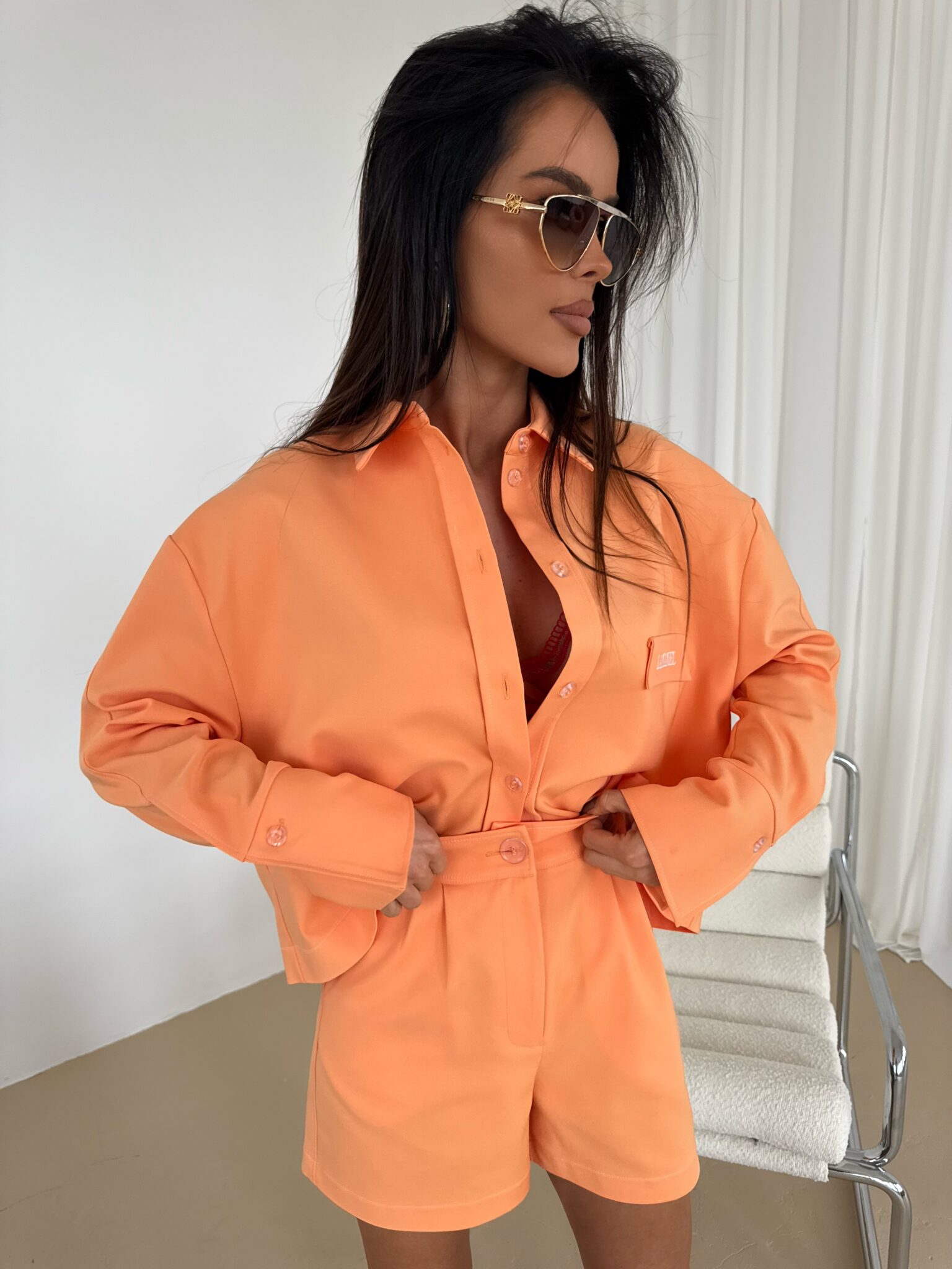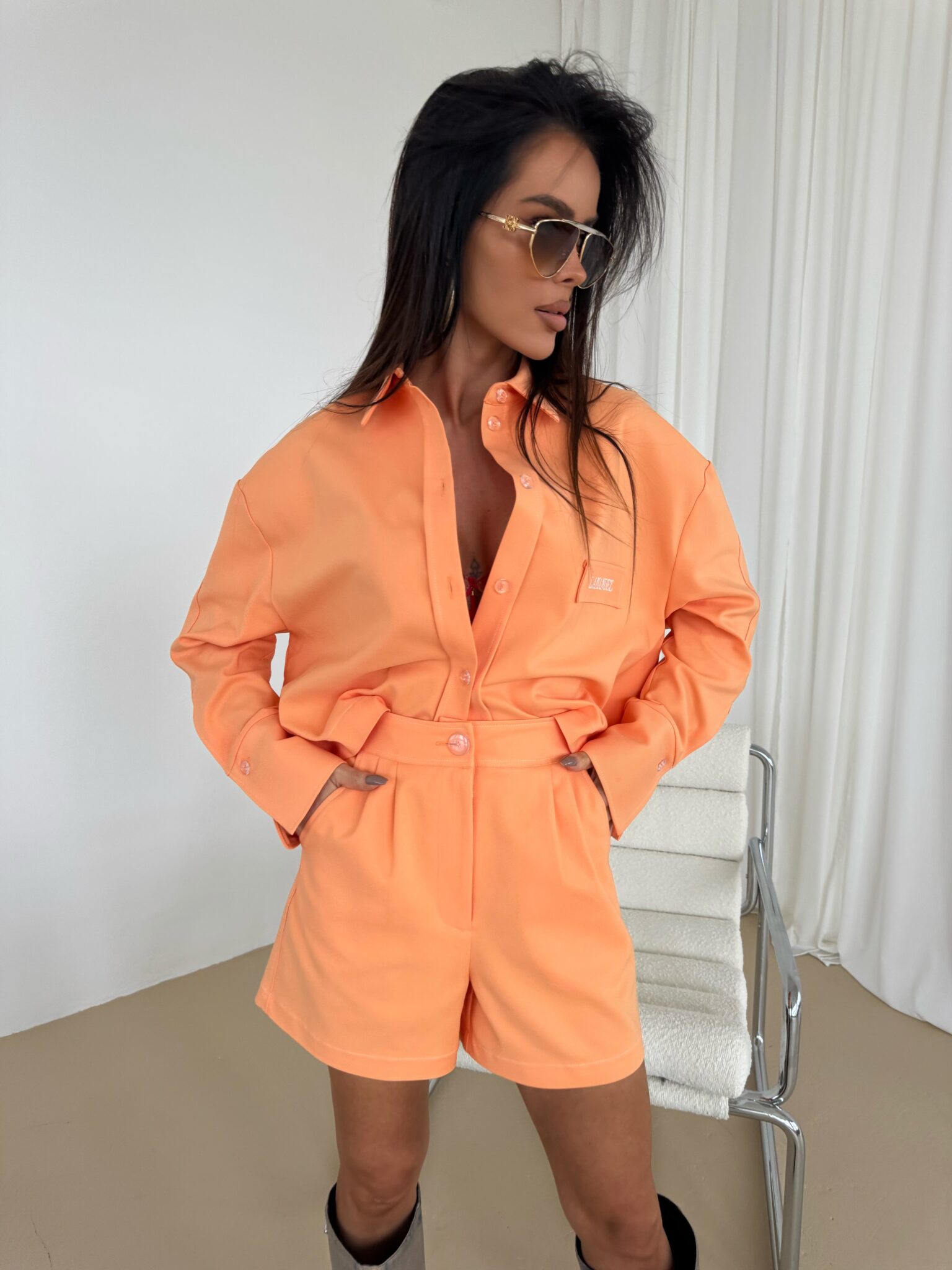 Shorts mit elegantem, aber dennoch lässigem Schnitt, mit hoher Taille, die die Taille betont. Hergestellt aus hochwertigem Stoff, der Komfort und ästhetisches Erscheinungsbild gewährleistet. Charakteristisches Designelement sind die Kontrastnähte aus farbigem Garn, die einen einzigartigen Akzent setzen und die Konstruktion der Shorts betonen. Seitentaschen mit soliden Riegelnähten sorgen für Strapazierfähigkeit, während dezent eingenähte Gesäßtaschen für ein klassisches Finish sorgen. Shorts mit Knopf- und Reißverschluss und präzisen Details. Sie passen sowohl zu lässigen Styles als auch zu eleganteren Outfits. Sie lassen sich sowohl mit einem Hemd als auch mit einem lockeren T-Shirt kombinieren und ermöglichen so vielfältige Styling-Effekte.