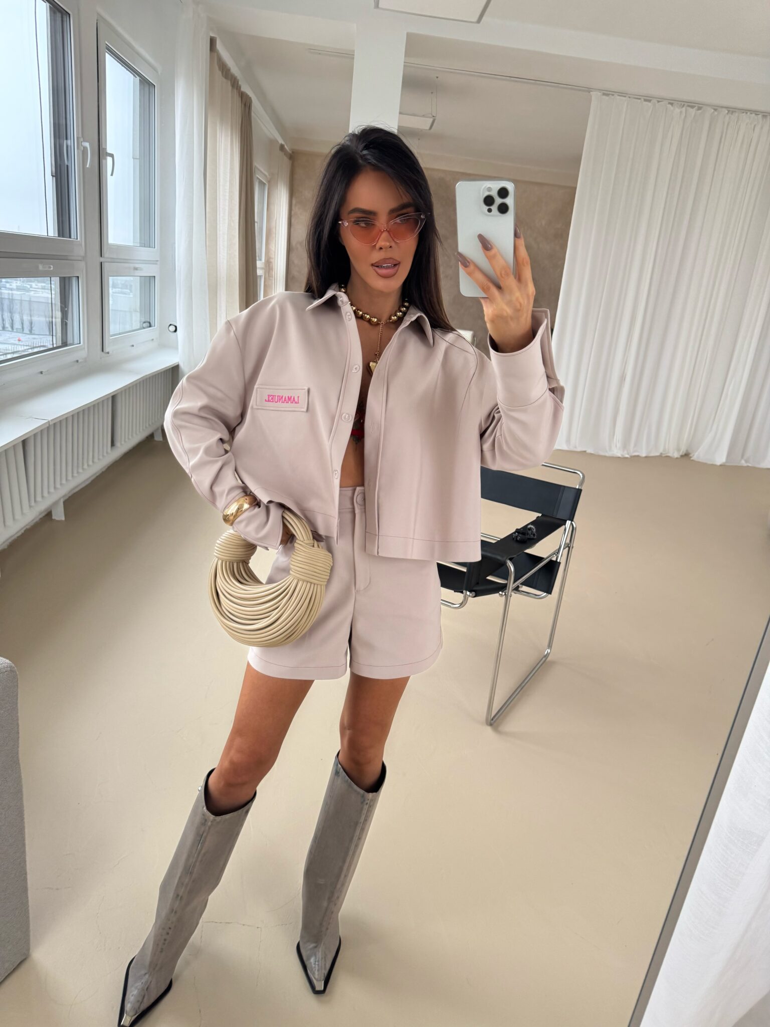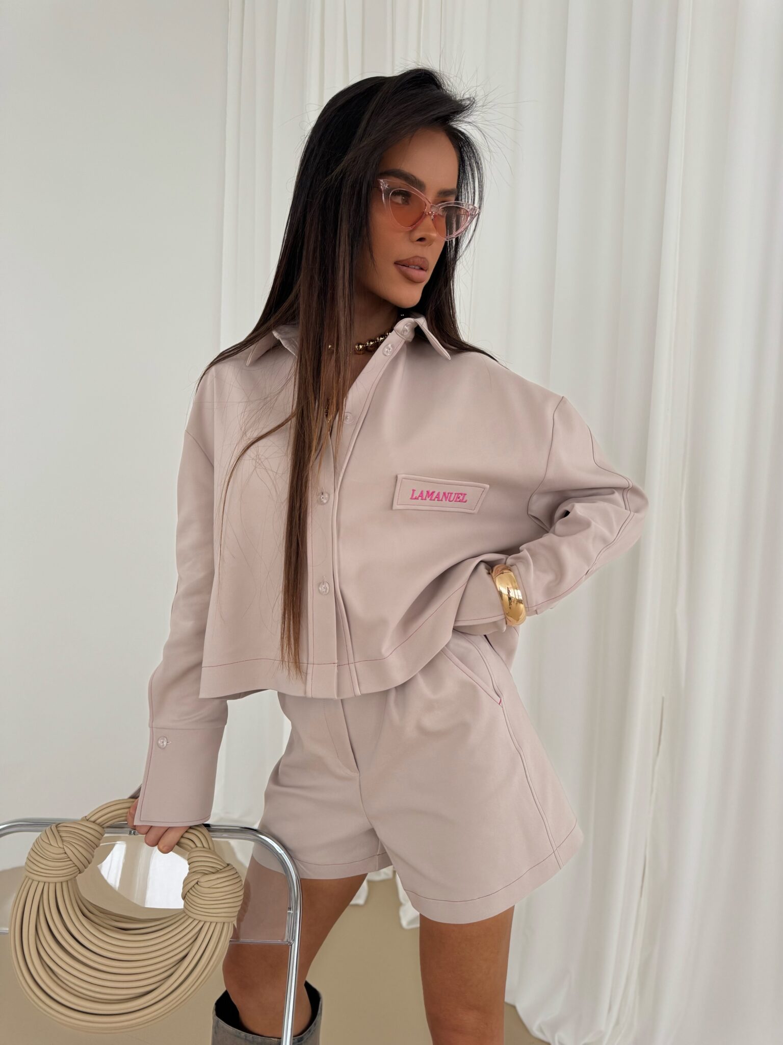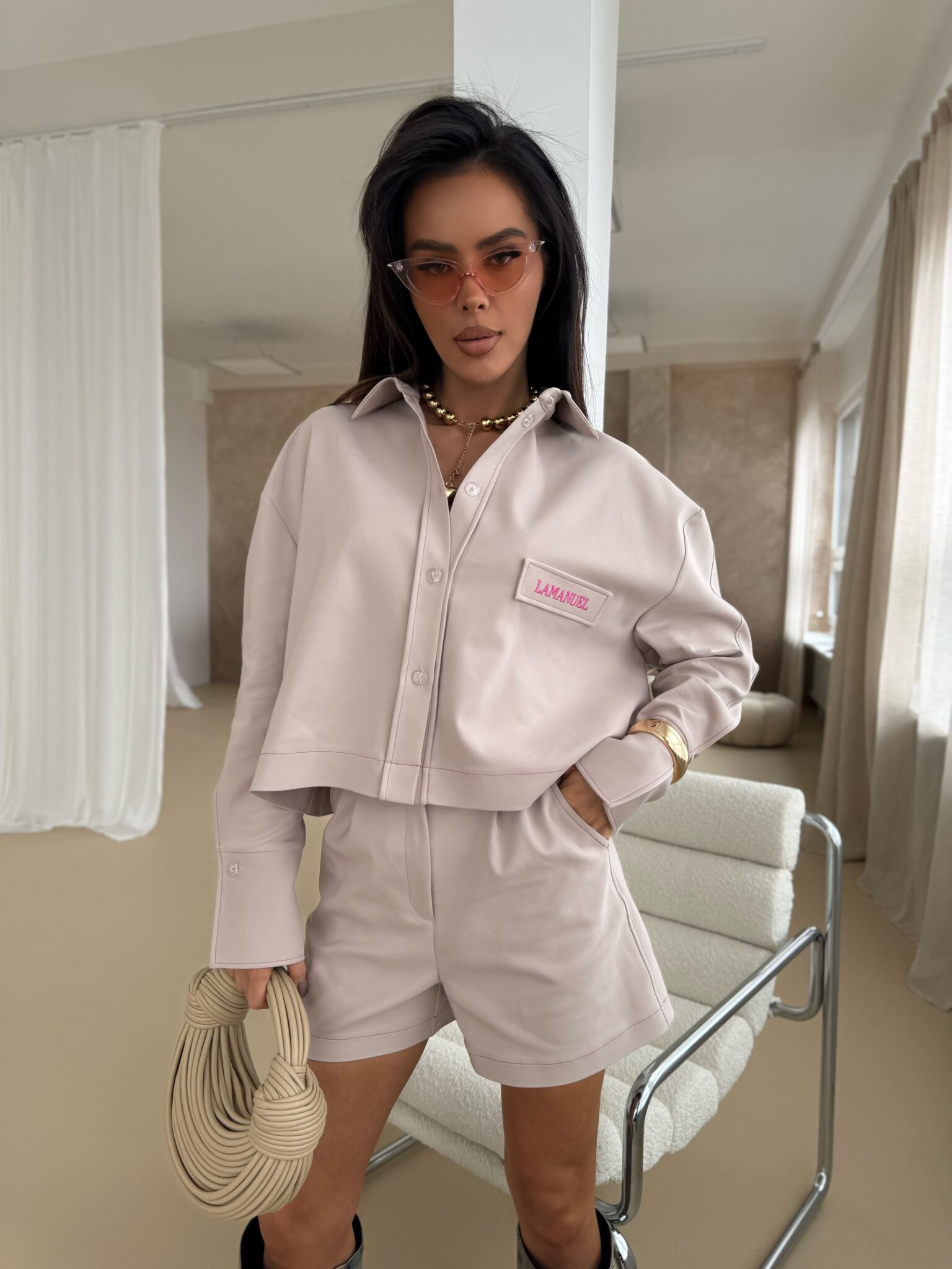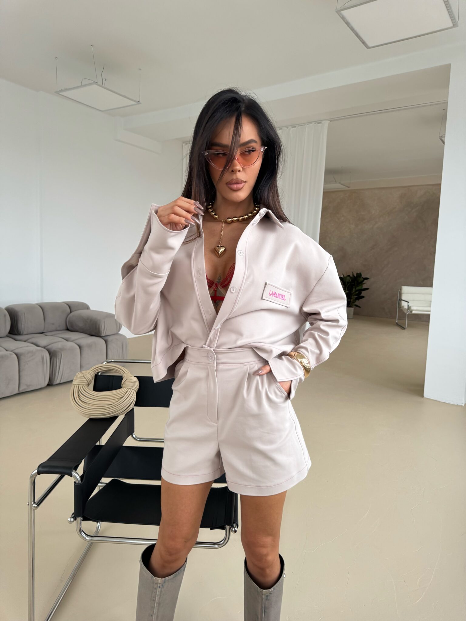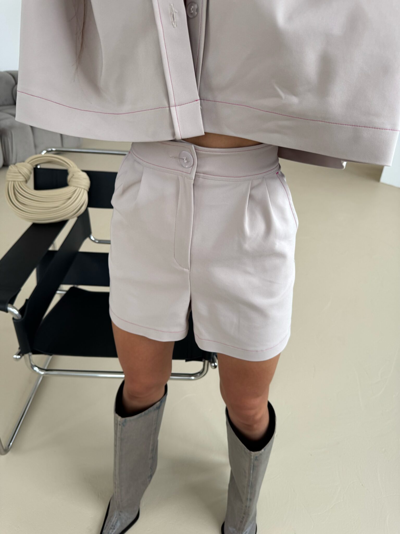 Shorts mit elegantem, aber dennoch lässigem Schnitt, mit hoher Taille, die die Taille betont. Hergestellt aus hochwertigem Stoff, der Komfort und ästhetisches Erscheinungsbild gewährleistet. Charakteristisches Designelement sind die Kontrastnähte aus farbigem Garn, die einen einzigartigen Akzent setzen und die Konstruktion der Shorts betonen. Seitentaschen mit soliden Riegelnähten sorgen für Strapazierfähigkeit, während dezent eingenähte Gesäßtaschen für ein klassisches Finish sorgen. Shorts mit Knopf- und Reißverschluss und präzisen Details. Sie passen sowohl zu lässigen Styles als auch zu eleganteren Outfits. Sie lassen sich sowohl mit einem Hemd als auch mit einem lockeren T-Shirt kombinieren und ermöglichen so vielfältige Styling-Effekte.